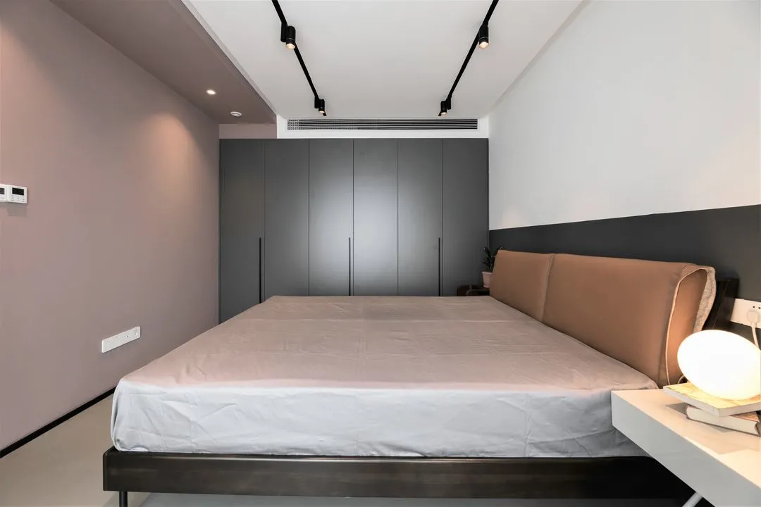 主卧以灰粉色调为主,简洁的硬装设计,依托材质质感呈现高级气质。双排轨道灯+筒灯设计,实现空间照明。深灰色衣柜设计到顶,搭配黑色长条门把手,满满的精致感。
