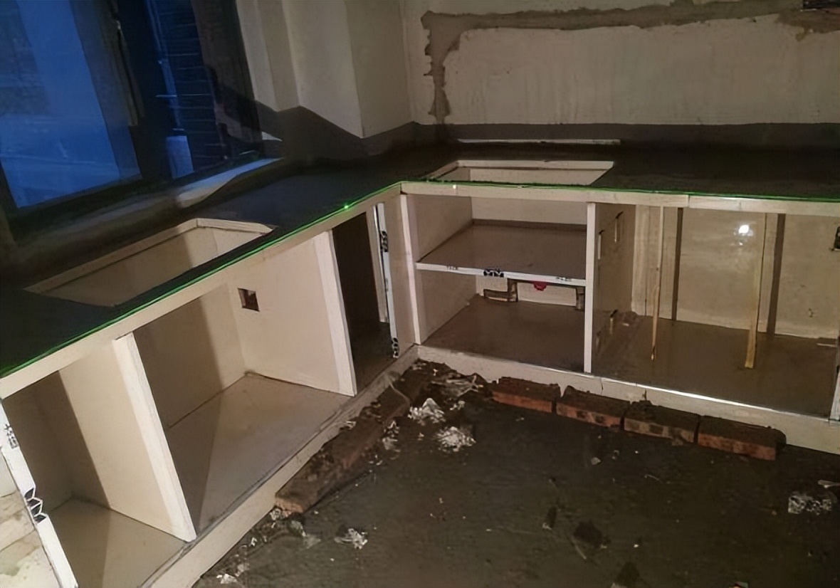2、1周左右,等瓷砖干透。板中需加铁钉,需在侧面加板,用于固定合叶。注意:需要留出水、气管开孔,水槽、灶具开孔同时留。找水工电工铺设电路。