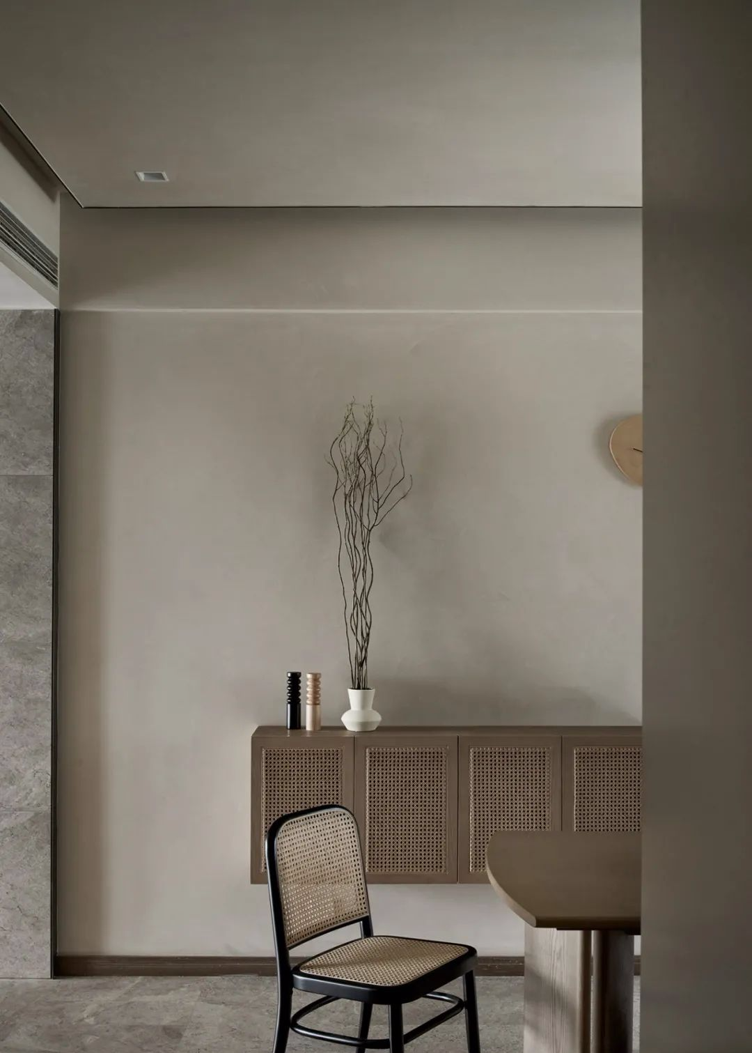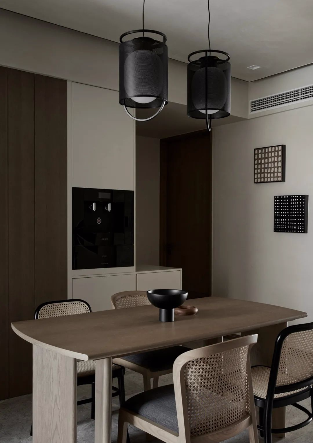 ▲ 原木餐桌搭配复古元素的餐椅,墙面装饰画的排序与藤编细节呼应,增加一组餐边柜让餐厅背景更加完整,嵌入式饮水机让里面更简洁