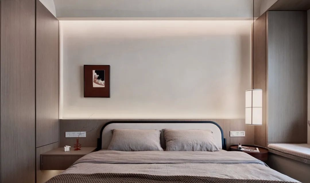 ▲ 主卧,秉承功能与美感平衡的设计理念,拆除过度装饰的老旧背景做圆弧吊顶,以简洁克制的手法呈现理性与浪漫的协同韵律