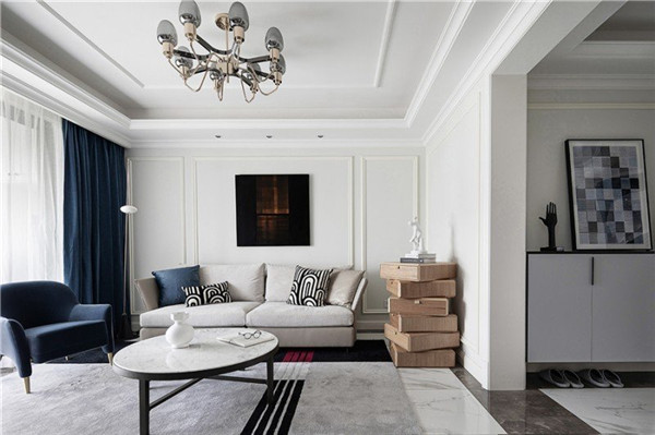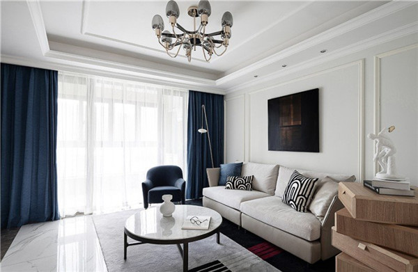 客厅墙面造型和家具的摆放,呈现对称的空间格局,进而达到一种稳重、大方、平和的基调。当明媚的阳光透进来时,蓝与白的空间色彩营造静谧而深远的观感。