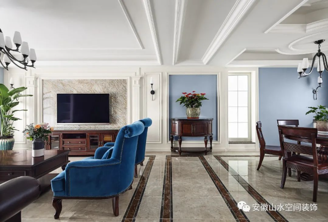 客厅空间通过色彩和材质的搭配,展现出典雅的氛围。摒弃了繁琐的装饰,采用了简洁明快的线条和具有质感的材料。配色方面选择了经典的组合,搭配了深邃的美式家具,呈现出典雅大气的效果,同时也散发着美式风情的轻松和自在。