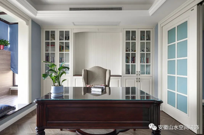 除了传统的美式书桌椅,整个空间的设计以明亮、整洁的现代风格为主,轻盈而优雅。