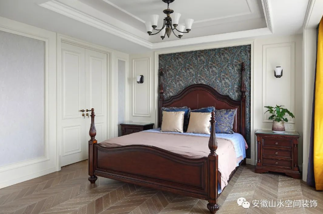 主卧室设计美观大方,整体以白色为主色调,运用带有花纹的墙壁作为点缀,配以深色家具,使空间充满了优雅舒适的现代风格。这种设计融合了理性和感性,营造出高级感和出色的设计感。