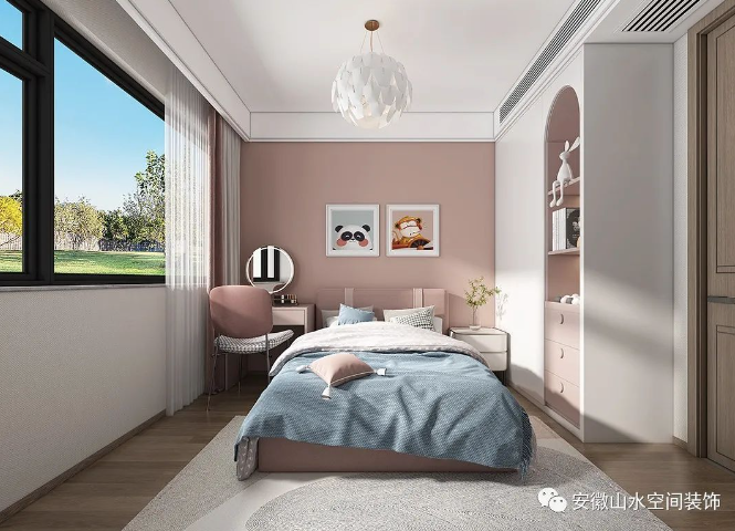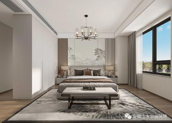 套房布局的主卧室,以衣柜作为分割介质,巧妙将睡眠区独立出来,强调了舒适和安静氛围的营造。墙咔与局部木饰面拼接装饰的背景墙,素雅的色调点缀以古典元素,给人以言有尽而意无穷的感受。
