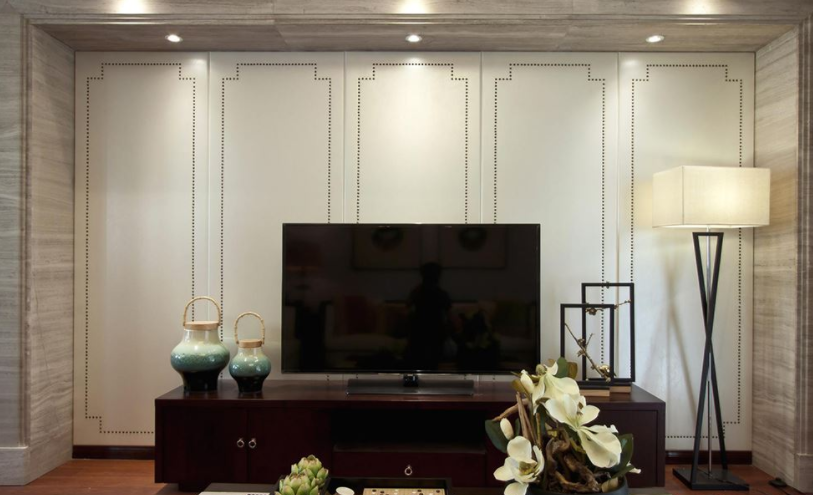 米白色布衣沙发配上,米白色的墙纸,空间很宁静电视背景墙硬包的边缘采用大理石包边设计,突显一丝低调的奢华。