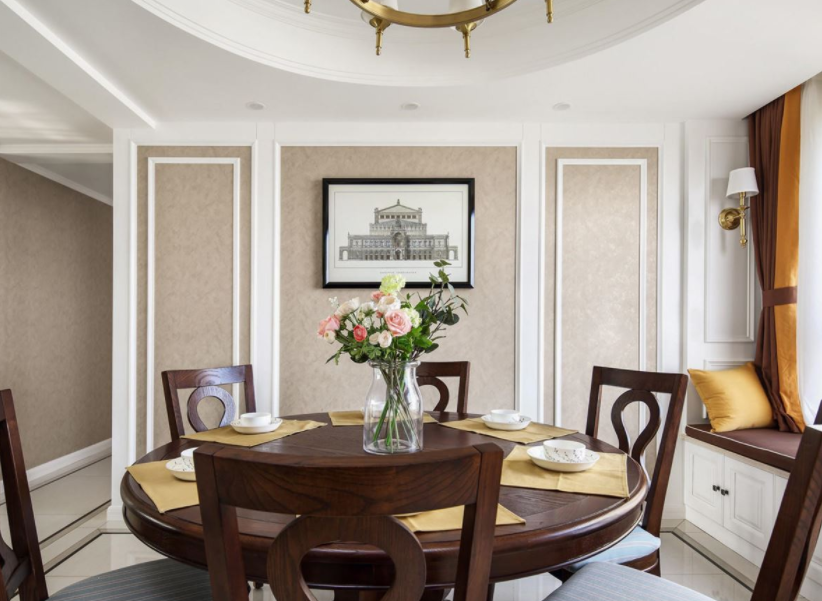 餐厅空间的组合柜,呼应玄关柜颜色,和谐一体。柜体中间掏空勾勒上石膏线,佐以金属质感的艺术挂饰,搭配上三盏小餐灯,轻奢有品的生活由此展开。