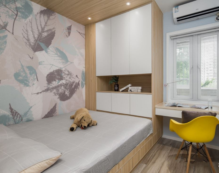 ▲利用柜子连接天花的处理手法,形成蜗居的感觉。大面积的墙纸可以让空间更灵动