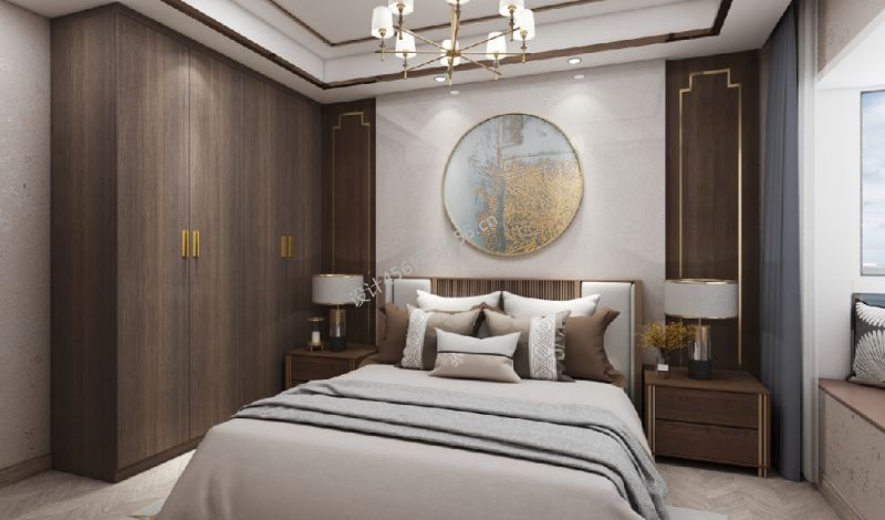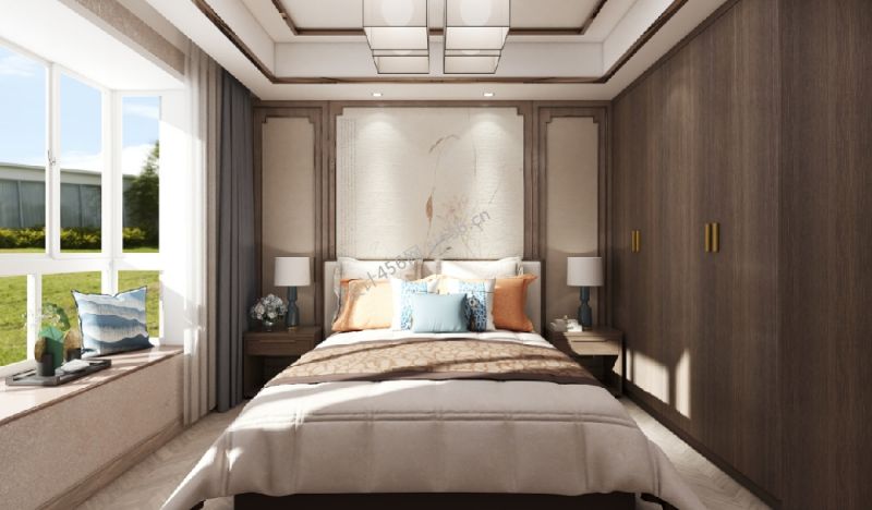 新中式风格四居室卧室床头背景墙装饰装修效果图