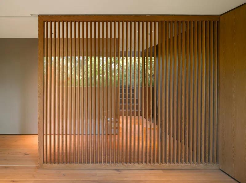 通过走廊寻找我们的卧室区域吧,通过可移动的幕墙,百叶栅栏的设计透光也通风,可以看出设计师的一些细节设计还是很到位的。