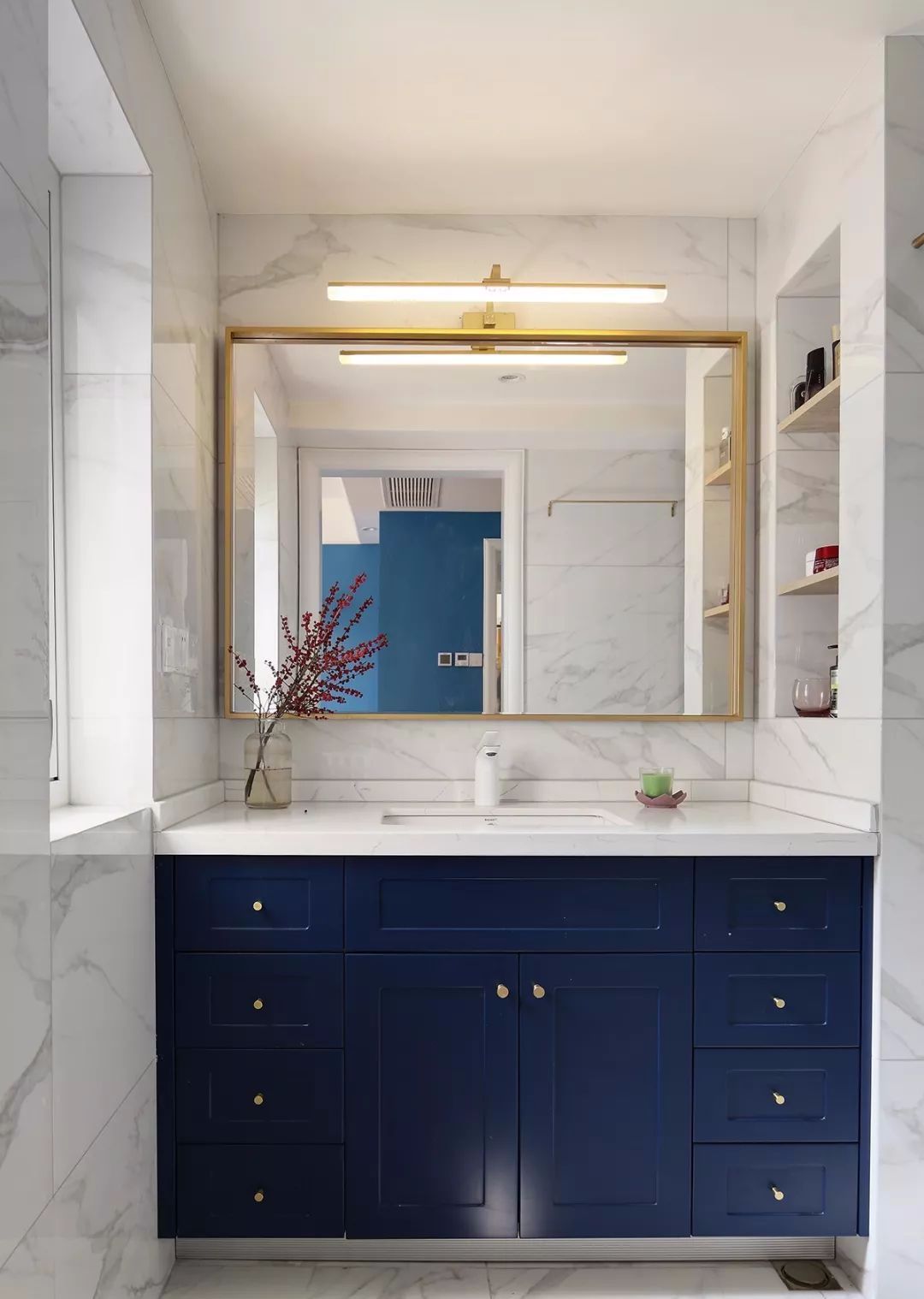 主卫部分干区的柜体采用了跟床头背景墙相呼应的沉静的蓝色,白色大理石纹的贴砖增添清爽、洁净感,黄铜色包边的镜子和镜前灯也起到画龙点睛作用。