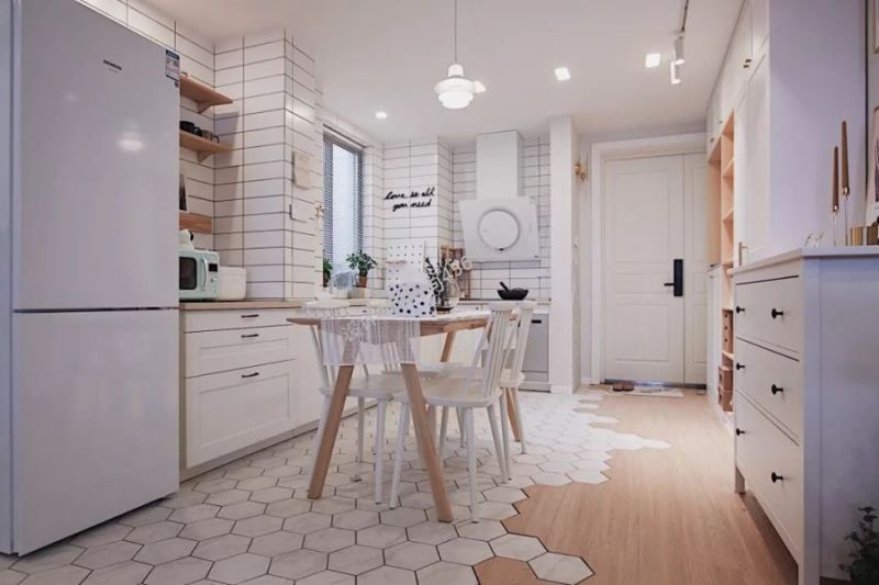 设计理念: 玄关与餐厅共同一个空间,地面以六边砖 木地板交错的铺贴,带来了一个优雅文艺的空间。大面积的定制玄关鞋柜,结合了展示与收纳功能,在导轨射灯的烘托下,呈现出一个独特的优雅。 玄关与餐厅共同一个空间,地面以六边砖 木地板交错的铺贴,带来了一个优雅文艺的空间。大面积的定制玄关鞋柜,结合了展示与收纳功能,在导轨射灯的烘托下,呈现出一个独特的优雅。