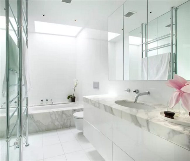 狭长的卫生间,无论是地面、墙面、灯饰、洗漱台盆等等,都是现代感十足,美观又精致。