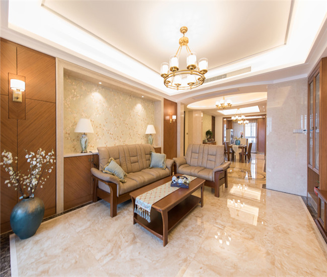 客厅是传统与现代居室风格的碰撞,设计师以现代的装饰手法和家具,结合古典中式的装饰元素,来呈现亦古亦今的空间氛围。