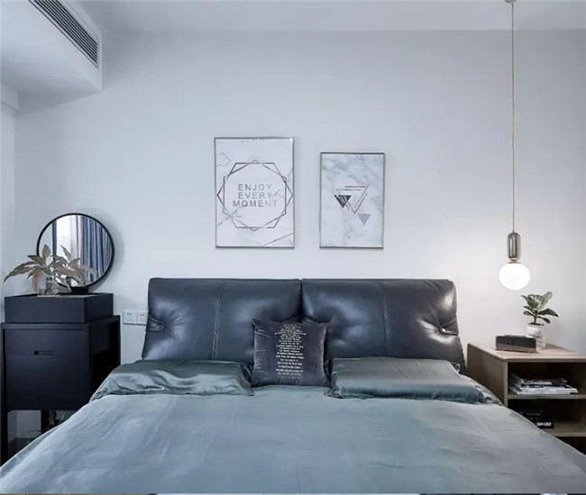 主卧整体以白色为主调,黑色皮质床头和黑色床头收纳柜,年轻时尚且舒适度、实用性都得到了满足。