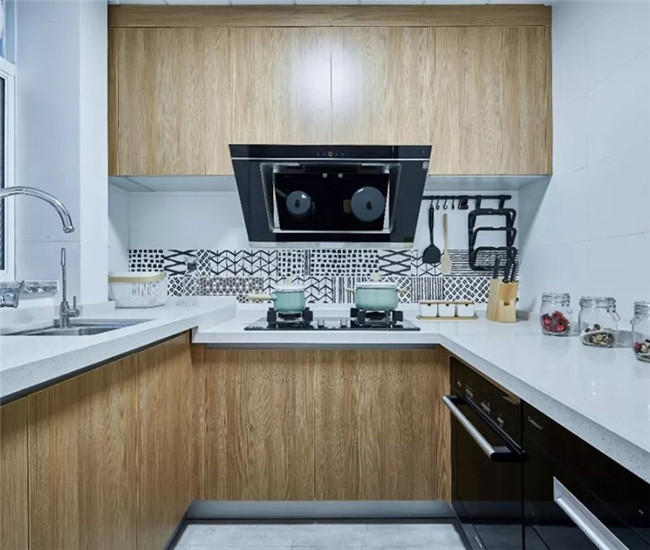 厨房以木色柜子为视觉中心,白色墙砖与台面,整个空间简洁清爽。U型厨房设计,功能规划合理,让下厨变得更加得心应手。