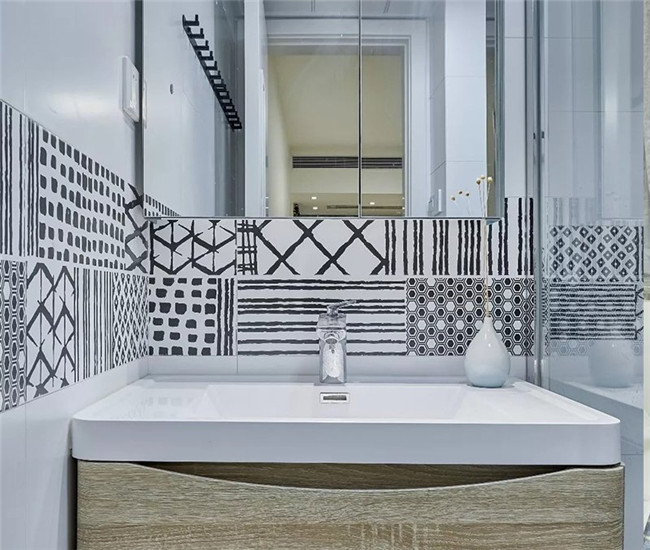 为达到良好的防潮效果而又不显得单调,墙面选用花纹墙砖,下方的裂谷柜增添了几分自然气息。