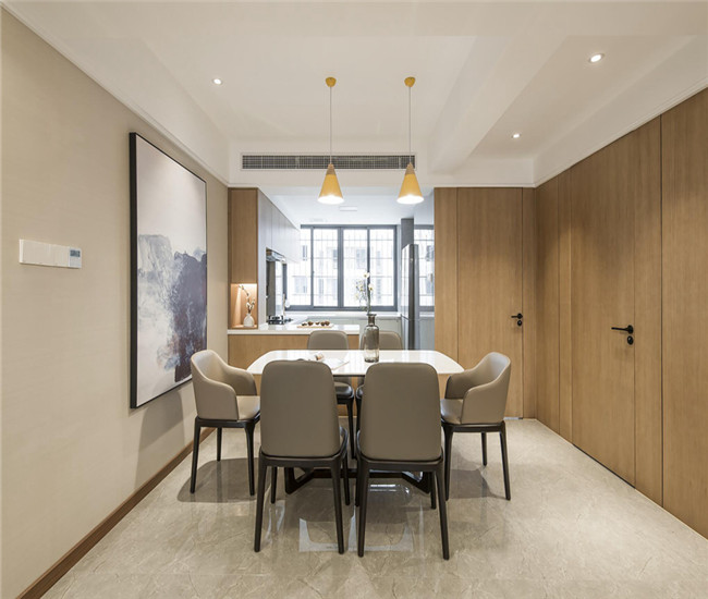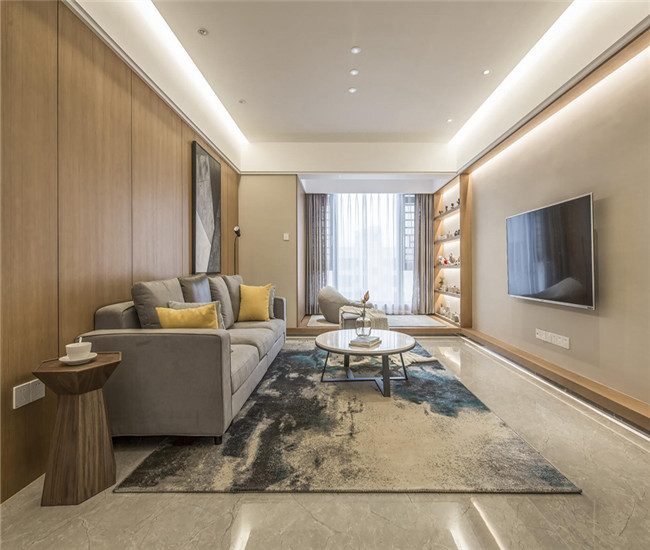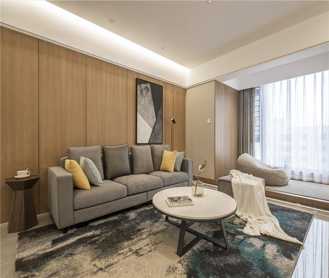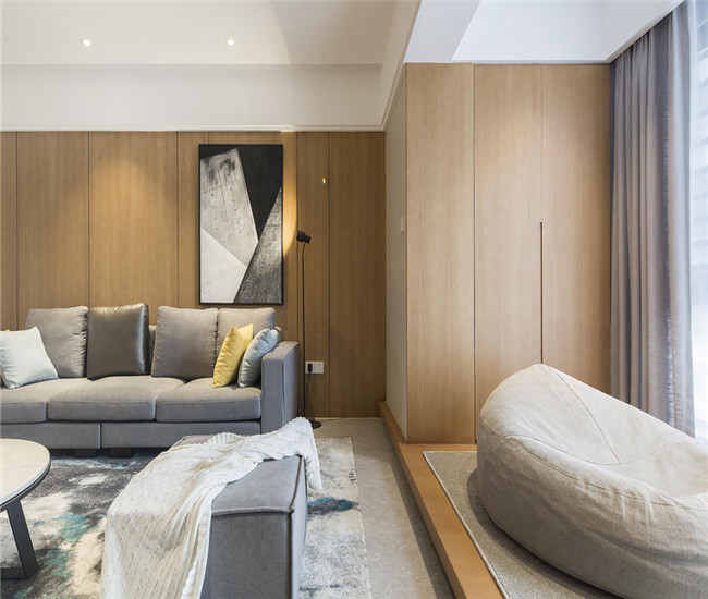 木色把它的温柔从沙发背景立面延伸至整个空间,家居气氛瞬间升温,最终给人呈现出这一派暖而亲和的景象。