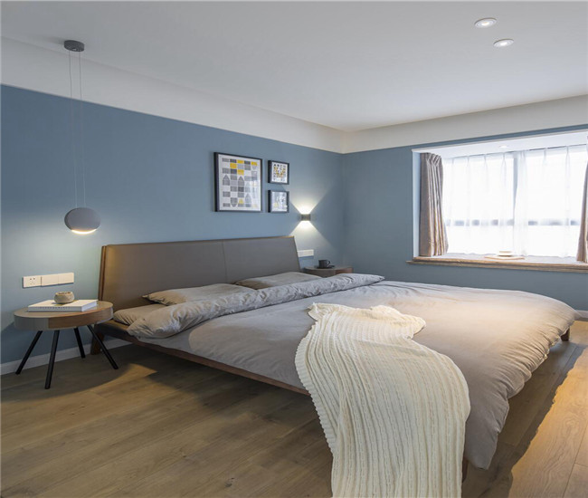 被雾霾蓝占领的整个空间,众生皆拜倒在它散发着清爽气息的石榴裙下。各居床头一侧的两盏异型灯具发出微而柔和的光,它们用自己的方式在为空间领主加持。