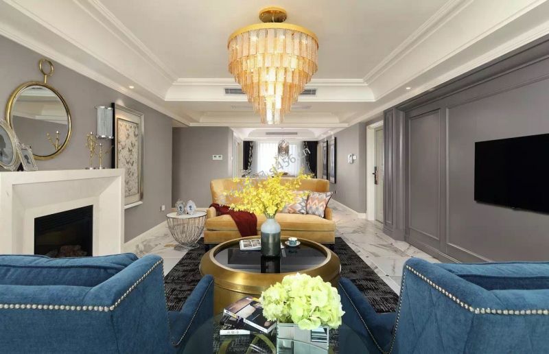 设计理念: 客厅,金色和蓝色非常跳跃,客厅高雅又富于变化。一抹深蓝/211平/简美风格 客厅,金色和蓝色非常跳跃,客厅高雅又富于变化。一抹深蓝/211平/简美风格