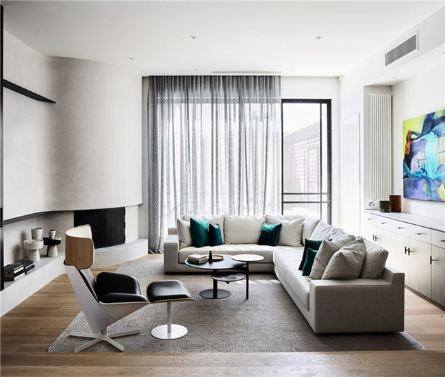 第一缕晨曦透过厚重的窗帘射入客厅,黑白灰的主色调完美承接、过渡了这道自然光线,都市的人们开启属于工作日的忙碌。