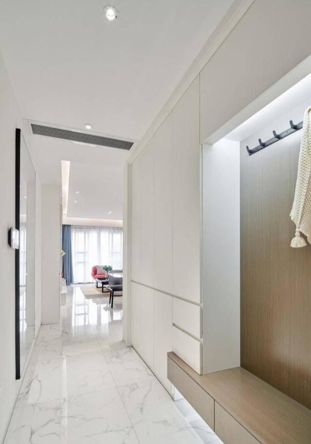 从入户到客厅,白色和木色的撞色和穿插,配合灯光挂衣区,和超大的落地全身镜,简洁时尚让整体显得简洁有力,挂衣区,换鞋区下方拖鞋区的设计体现了人性化的细节。