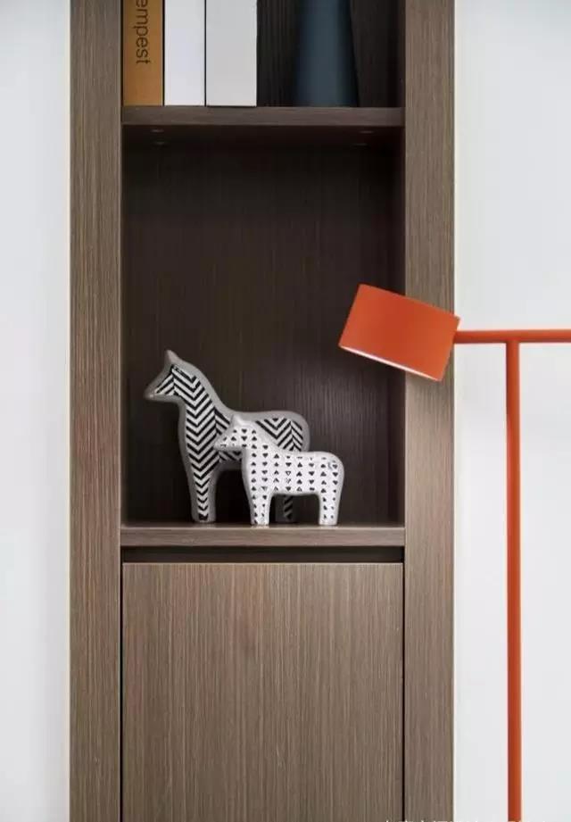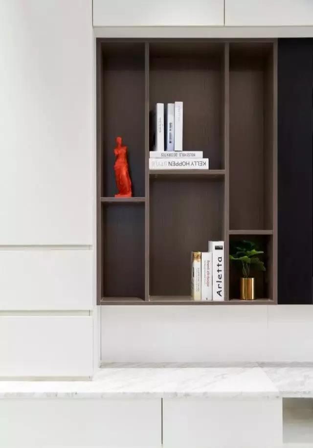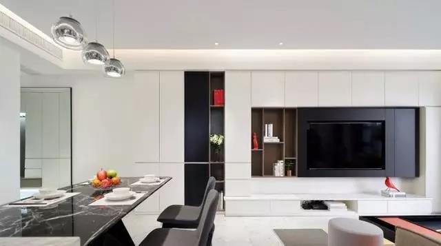 客厅的电视柜和餐边柜装饰柜形成一个整体,在根据颜色深度做了一些撞色和穿插,餐桌的颜色也很好的呼应了柜子颜色的比重。
