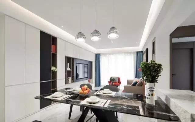 客餐厅大空间形成一个大的整体,客餐厅的天花在满足左边长柜的情况下,做了天花最大化最开阔的下出光处理,这样会让视觉效果很开阔。
