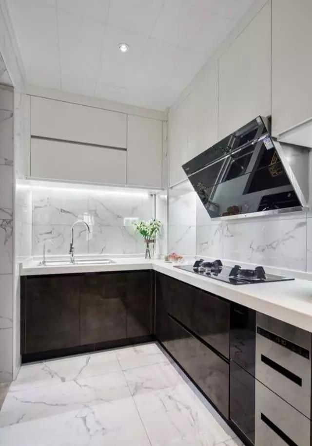 厨房都是统一在大空间下做的黑白对比色,吊柜下方为满足照明的功能性也做了灯带,整个地面墙面的铺贴延续客厅的地面,整体简单大方。