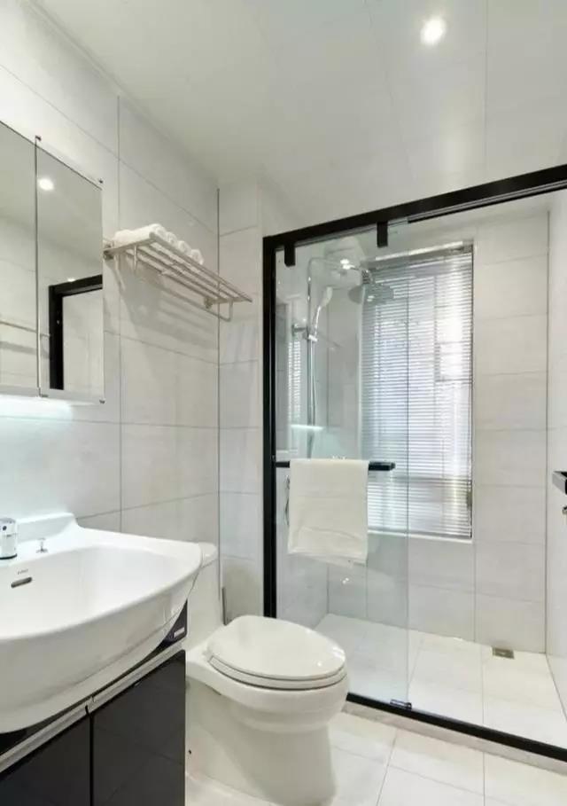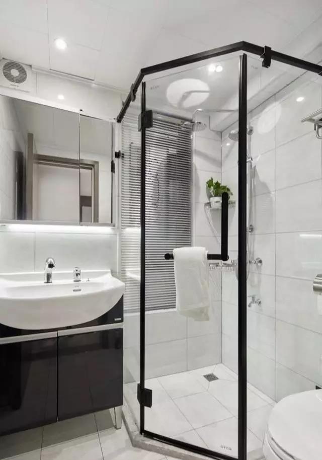 公共卫生间由于布局的改动用的是钻石型的淋浴房,镜柜上下也留有灯带,作为辅助的照明相对舒适。