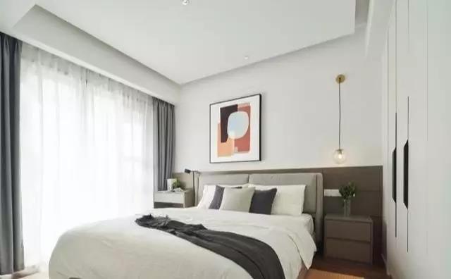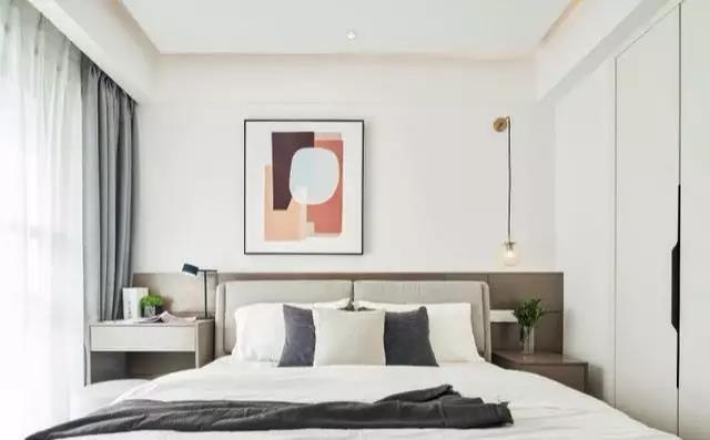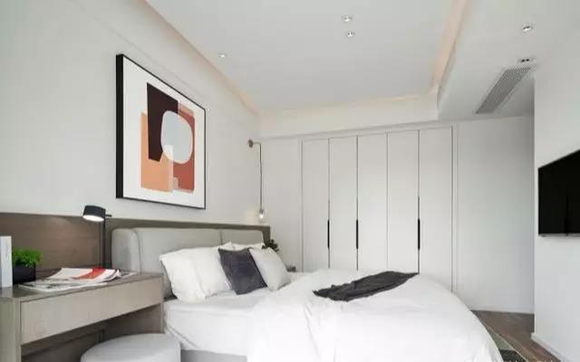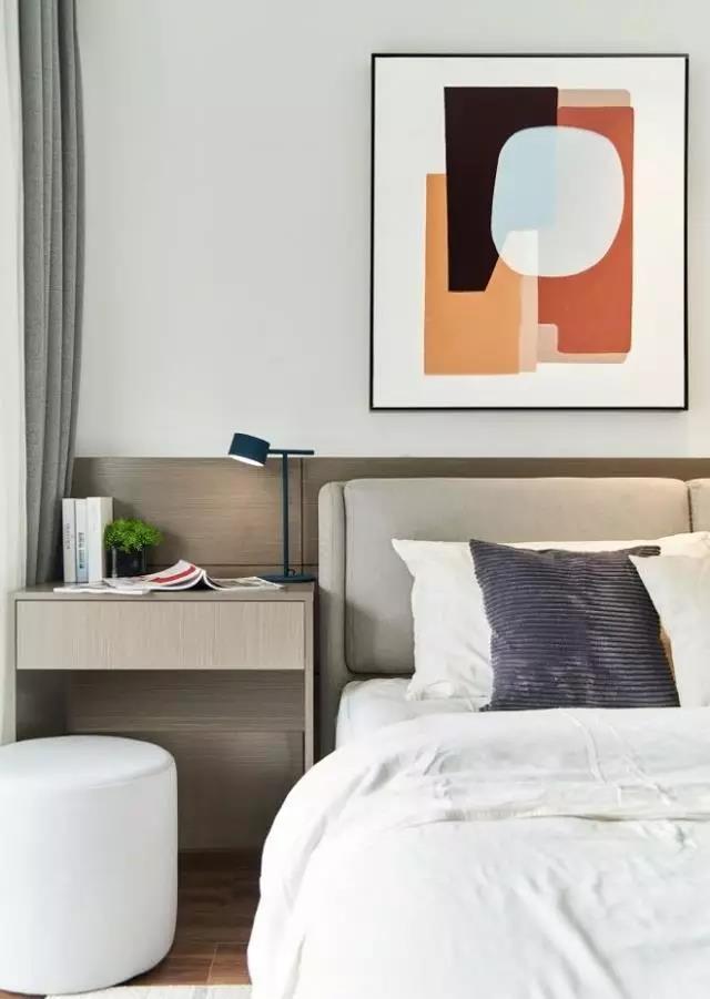 卧室的色系延续了客餐厅空间的感觉,没有饱和度的色彩让空间感觉舒适和温馨,床头通过漫反射下来的光线,让卧室的氛围会更显温馨一些。