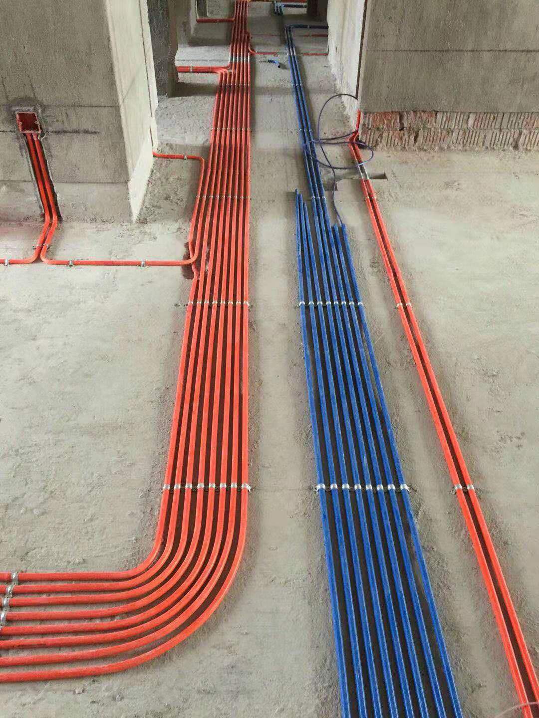 布管接线:按照开槽处布管,同槽不许双管,单管不许多线,强弱分开;墙面管道铺设完毕之后所有接头处要求接线,使用绝缘胶布,不得外漏铜芯。