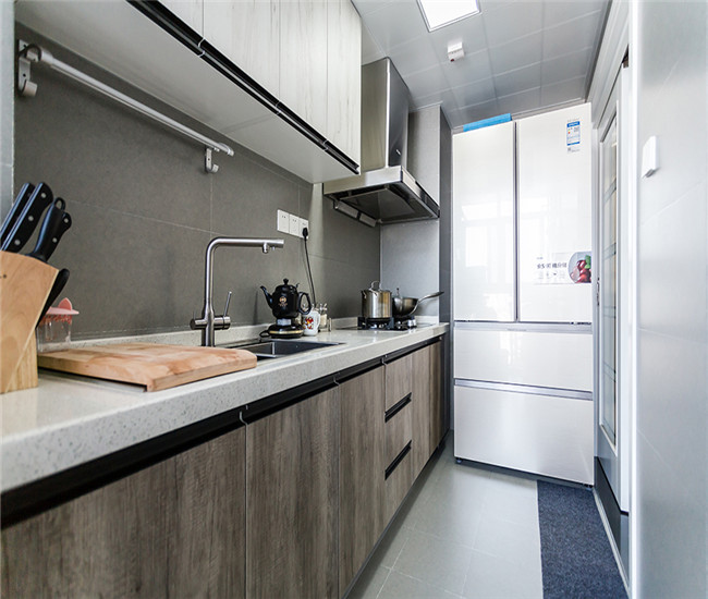 因为厨房本身也是比较小,所以我们做了一个一字型的橱柜,这样让空间得到了一个整体的利用
