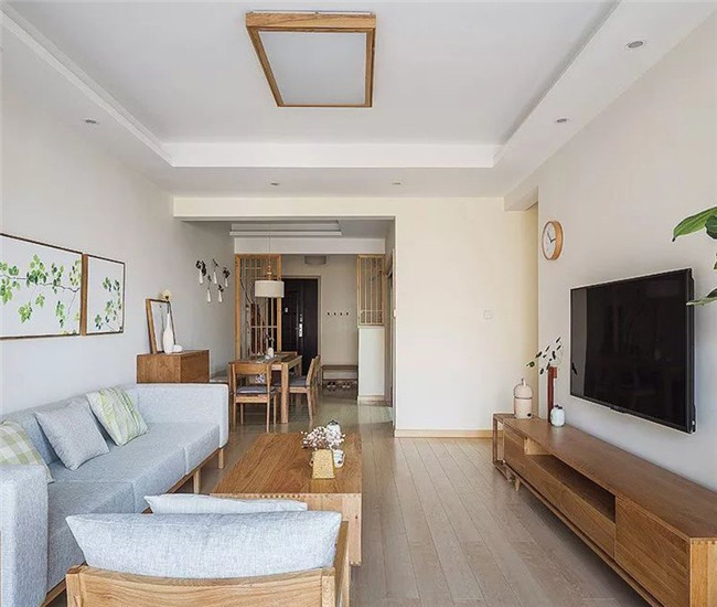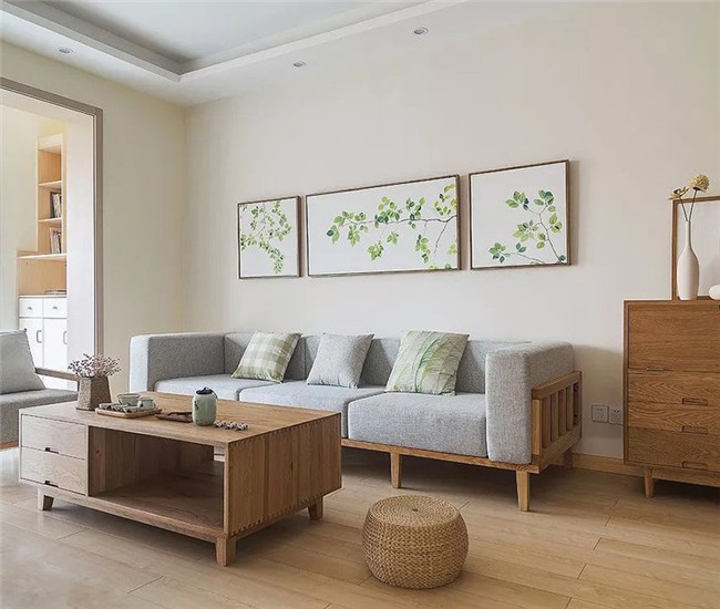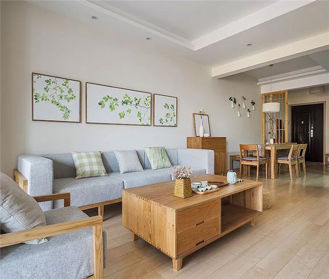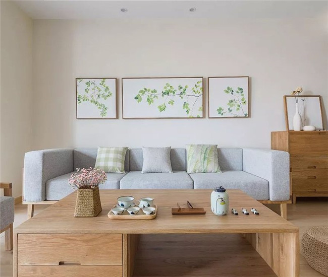 客厅以木色、白色、浅灰色为主色调,小面积点缀低饱和度的自然系色彩,如沙发墙的挂画,如微风拂面一般轻柔细腻。