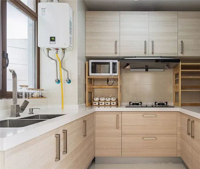 厨房浅色木纹橱柜,搭配白色的台面,看上去非常的清爽整洁,充满自然气息。