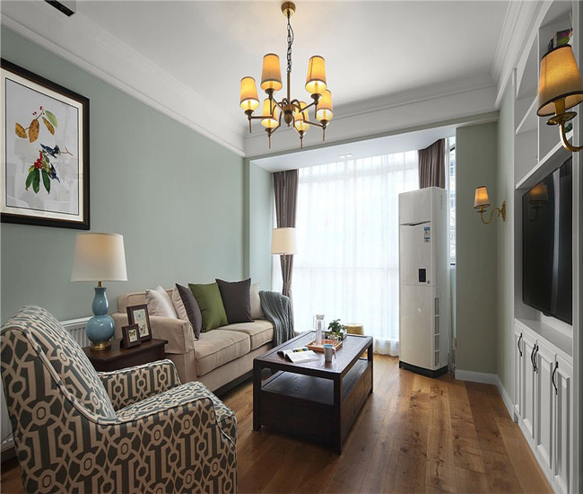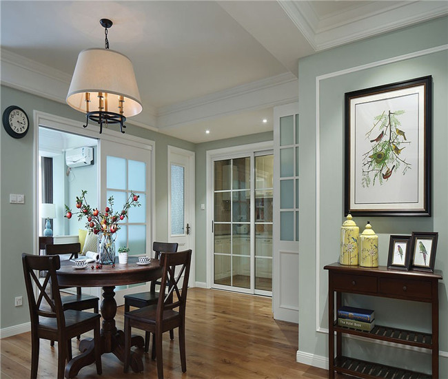 在设计上,墙面选择淡淡的灰绿色来营造整体浪漫轻松的氛围,而在硬装比如吊顶的处理上,借鉴现代手法尽量简化,白色家具穿插其中调整气氛,局部美式线条点缀勾勒。