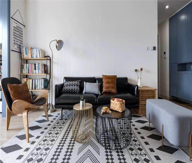 沙发背景墙选择留白,这样不做任何装饰竟也特别好看,正好和黑色的皮质沙发形成鲜明对比。墙角处搭配了一个简易书架,瞬间就提高了客厅的品位。