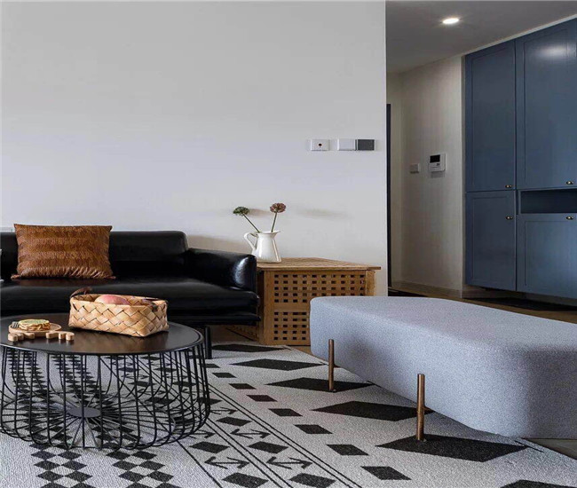 镂空的铁艺茶几,设计得非常有个性,黑白几何图案的大尺寸地毯,也丰富了整个会客区。