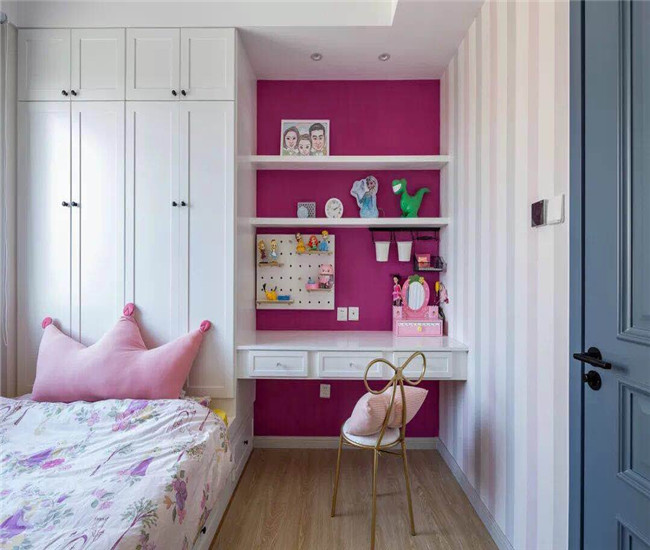 儿童房选择了玫红色和粉红色加以点缀,更显少女心和活力。榻榻米组合衣柜书桌书架一体化的设计,可以帮助更充分地利用空间面积。