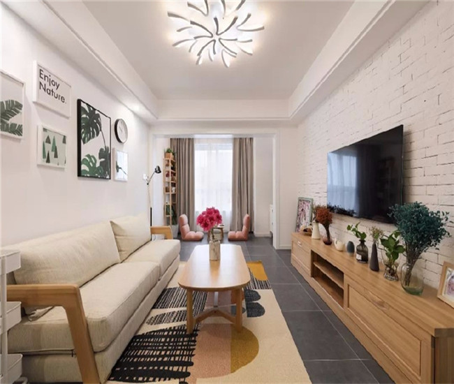 【设计说明】本案例是131平米日式风格的三居室,客厅电视墙以白色文化砖打造,木色电视柜上摆一排的绿植,在壁挂电视机的组合下,显得简洁文艺而又清新。