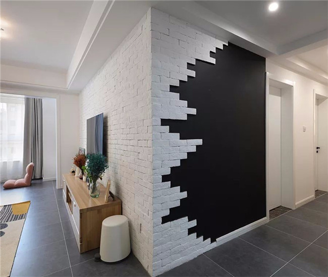 电视墙连贯过来的过道墙面,把白色文化砖与黑板墙组合搭配一起,让这里成为一个文艺又情调的小墙面。