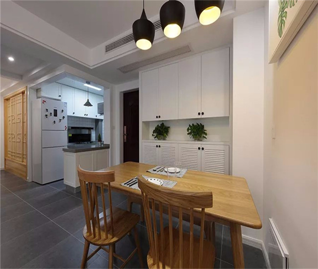 餐厅布局在入户门旁边,入户们旁边的餐边柜与鞋柜组合在一起,中空位置2盆清新的绿植,搭配一套原木质感的餐桌椅,并挂上3盏小资格调的吊灯,整体显得情调而又舒适。