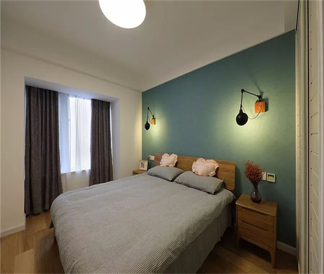 主卧整体空间非常简单,床头背景墙以素蓝色为主,挂上2盏独特的壁灯,搭配上一套舒适的木质床与蓝色条纹床单,整体显得格外的年轻自然