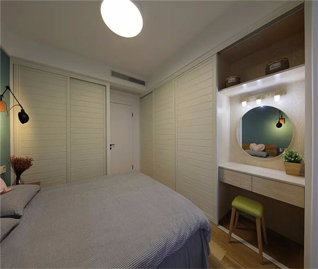 床尾位置做了一个梳妆台,同时整个卧室拥有大面积的收纳衣柜,为主人提供了方便与储藏功能。