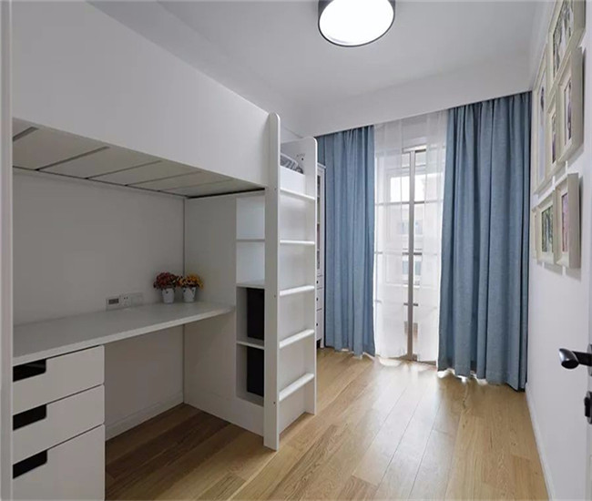 次卧为了给孩子提供了一个独特的上下铺,上铺是床、下铺是书桌,同时还有抽屉跟书架,侧边嵌入了一个小衣柜,整体时尚又实用。