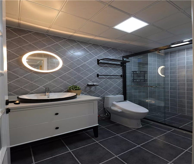 卫生间以黑白灰的时尚优雅质感下,加入一款独特的圆形带光环的镜子,呈现出一个现代独特的空间感。