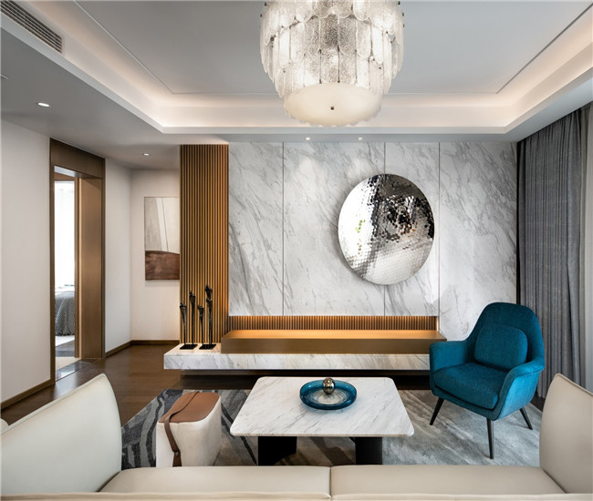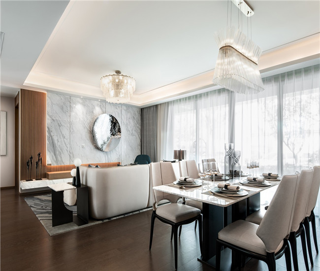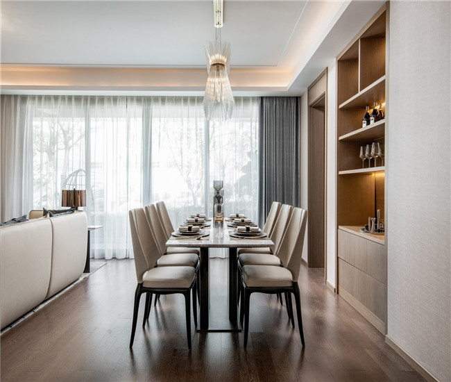 【设计说明】本案例是124平米现代风格的三居室,整个空间以充满韵律的米白为主色,配以温润原木,低奢与感性美好共存,相得益彰。客餐厅里皮革,布艺,大理石,实木与金属,看似没有关联的多样元素相互碰撞,组成了引人入胜的生活。加之点缀的深青色沙发椅,使闲适生活不失层次,静雅品质体现在于精致细节巧妙处理。厨餐客一体的设计本身就带来大气端庄的大户人家的非凡气度,低调奢华的水晶吊灯也提升了空间品味。
