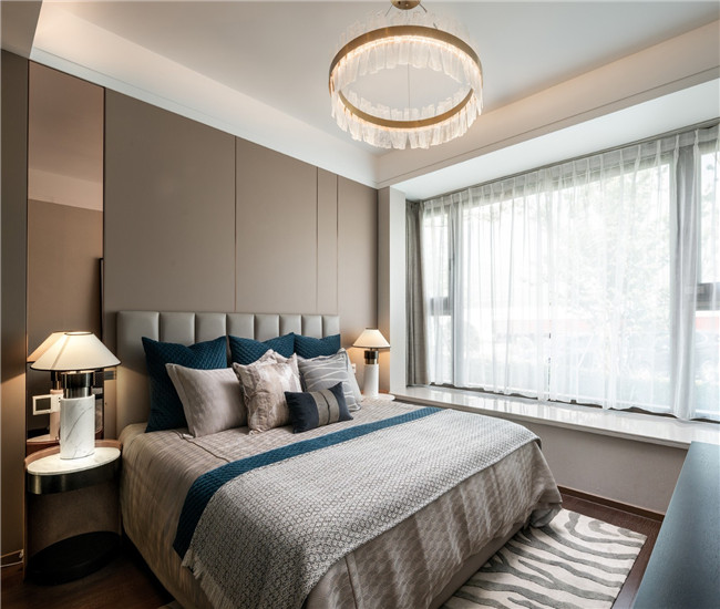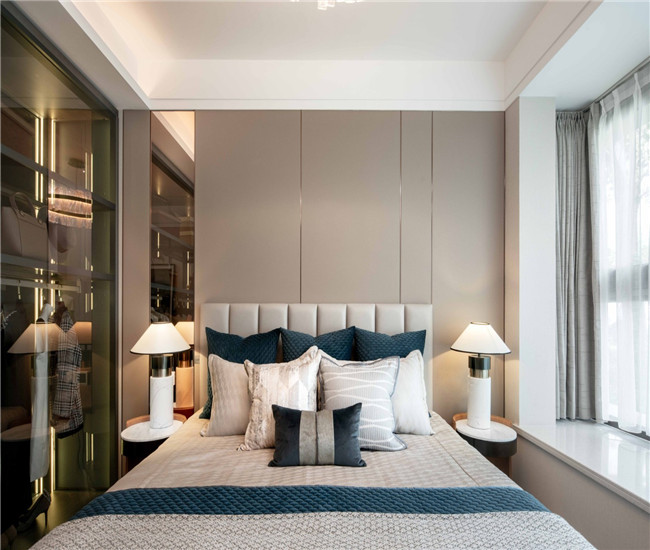 主卧里最亮眼的是茶色透明衣橱,简约又时髦,设计师利用它自然间隔出时尚高贵的衣帽间,将艺术与实用相结合,营造出高端的生活空间。