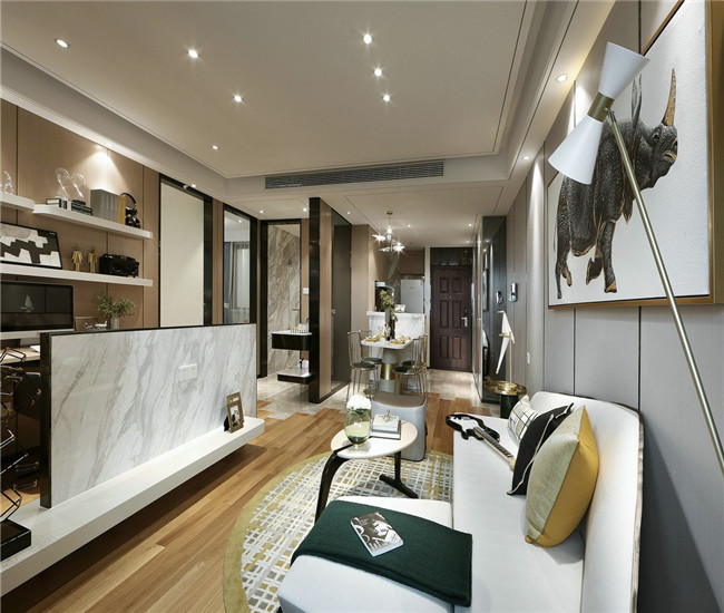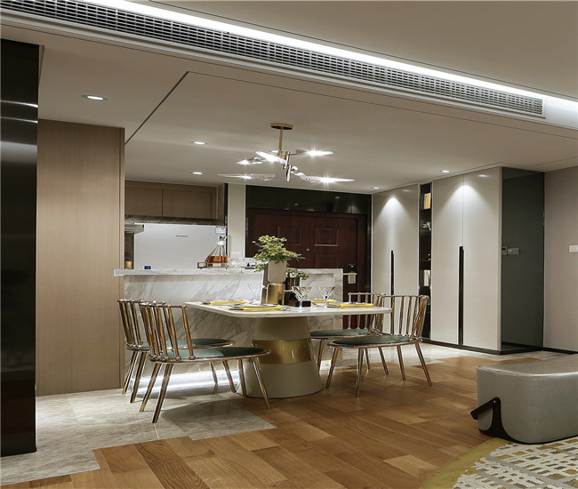 【设计说明】本案例是129平米现代风格的三居室,石材花纹加上金属材质打造出来的现代风格住宅,半通电视背景墙既有背景的功能,亦能更加完美的利用空间,开辟出一个精美的小书房。开放式厨房更加使视野开阔。