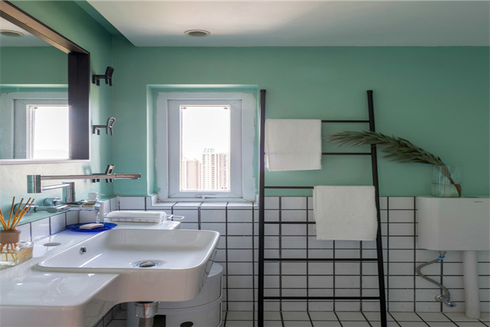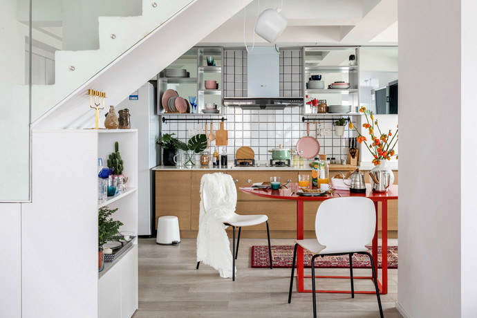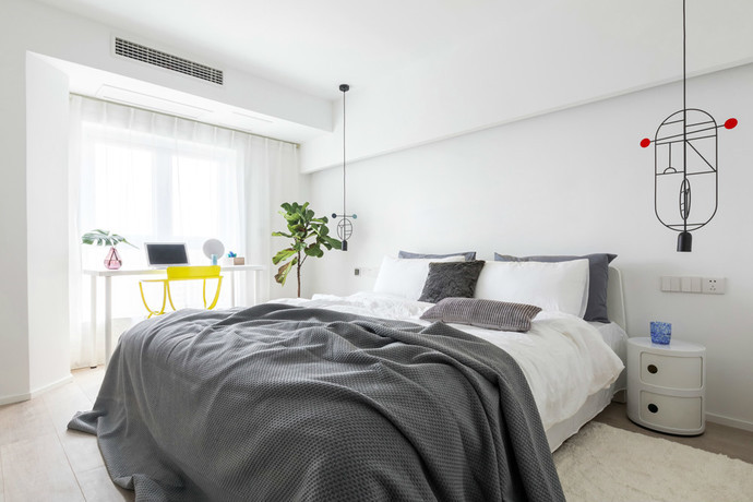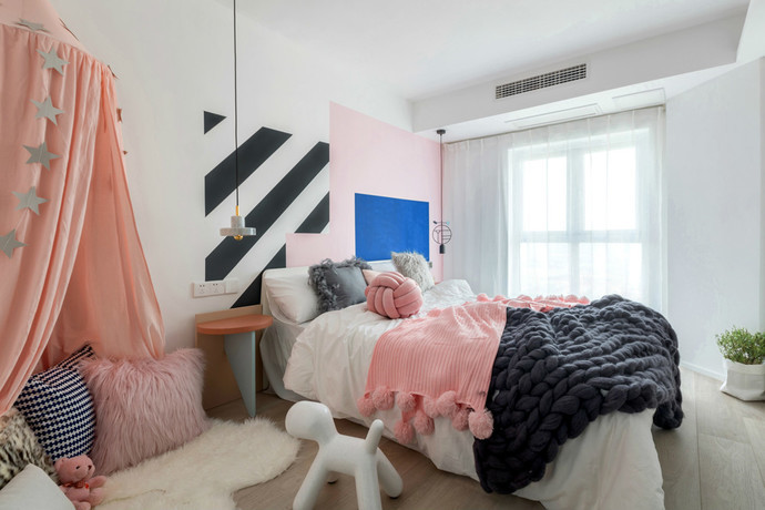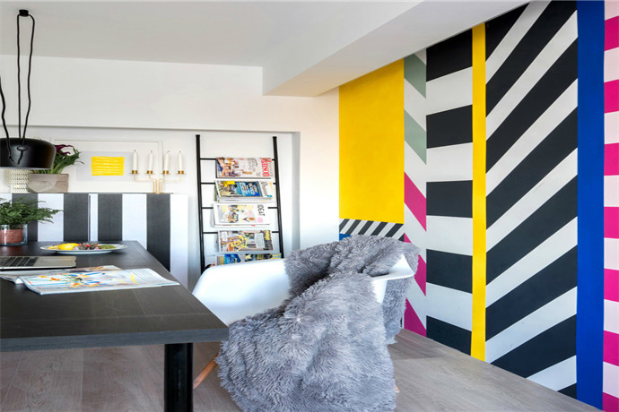 【设计说明】本案例是起点壹中心120平米孟菲斯风格的4居室,鲜艳的色彩、打破常规原则的线条结构以及乐观、自由、无所畏惧的态度。孟菲斯这个设计风格正好完美符合设计师的要求,正正是表达了她想要给这个空间赋予的意义。